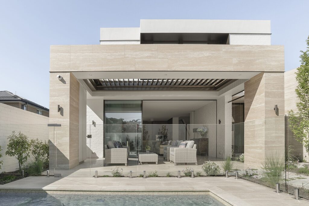 Jednou z hlavních výhod série Travertino je její vhodnost pro odvětrávané i kontaktní fasády. Velkoformátové keramické desky s nízkou tloušťkou umožňují architektům vytvářet elegantní a zároveň technicky spolehlivé obklady budov.